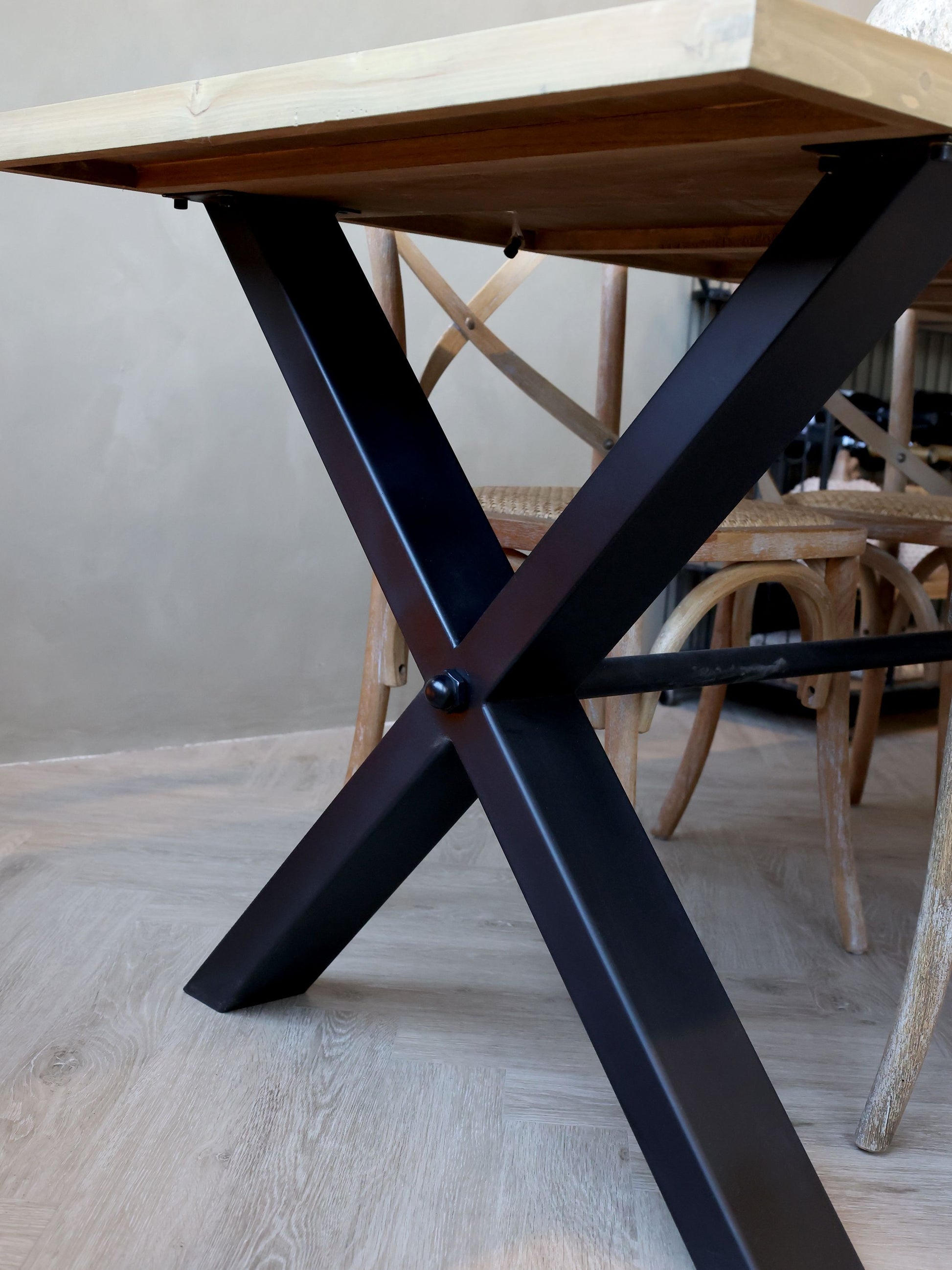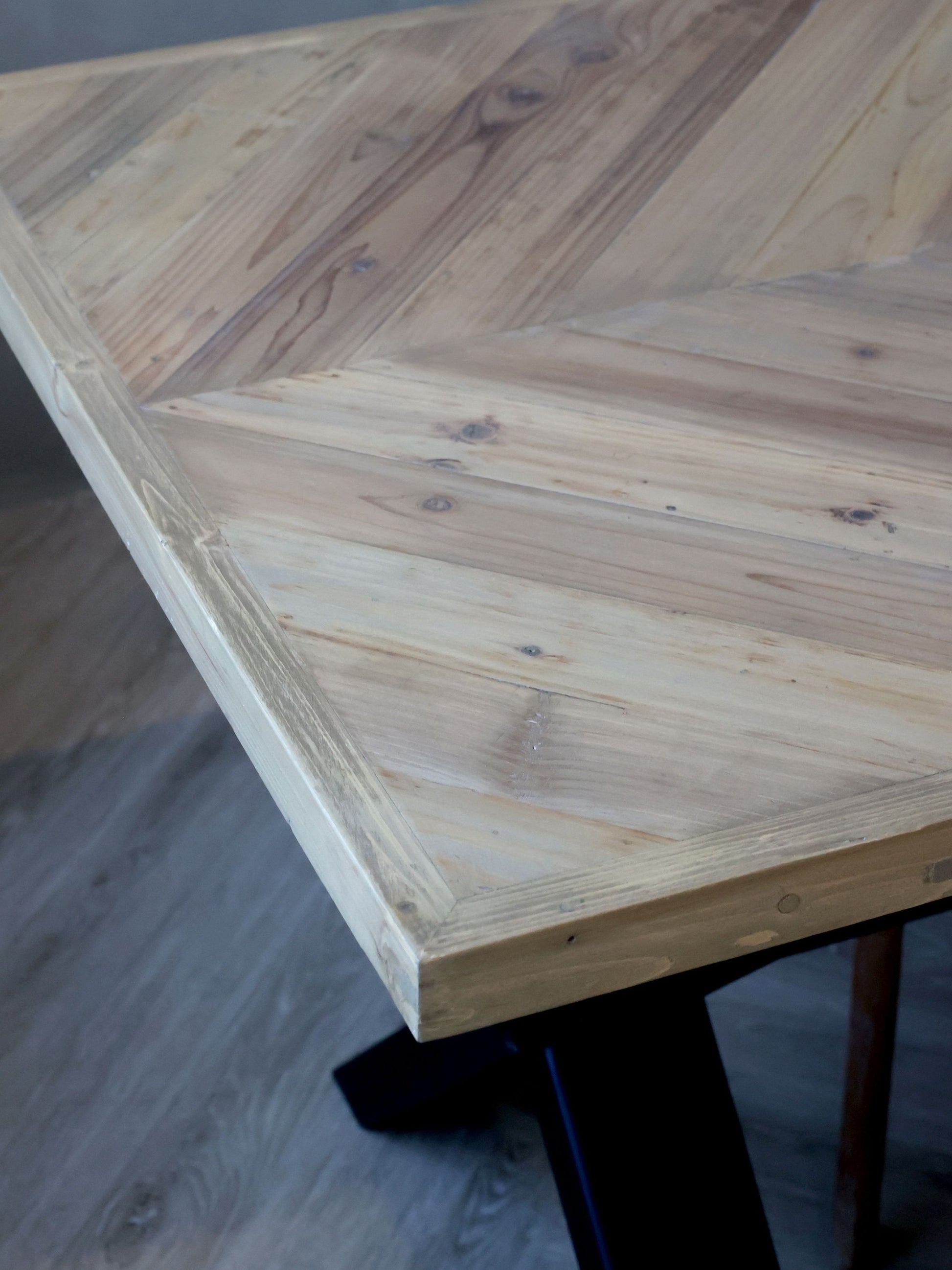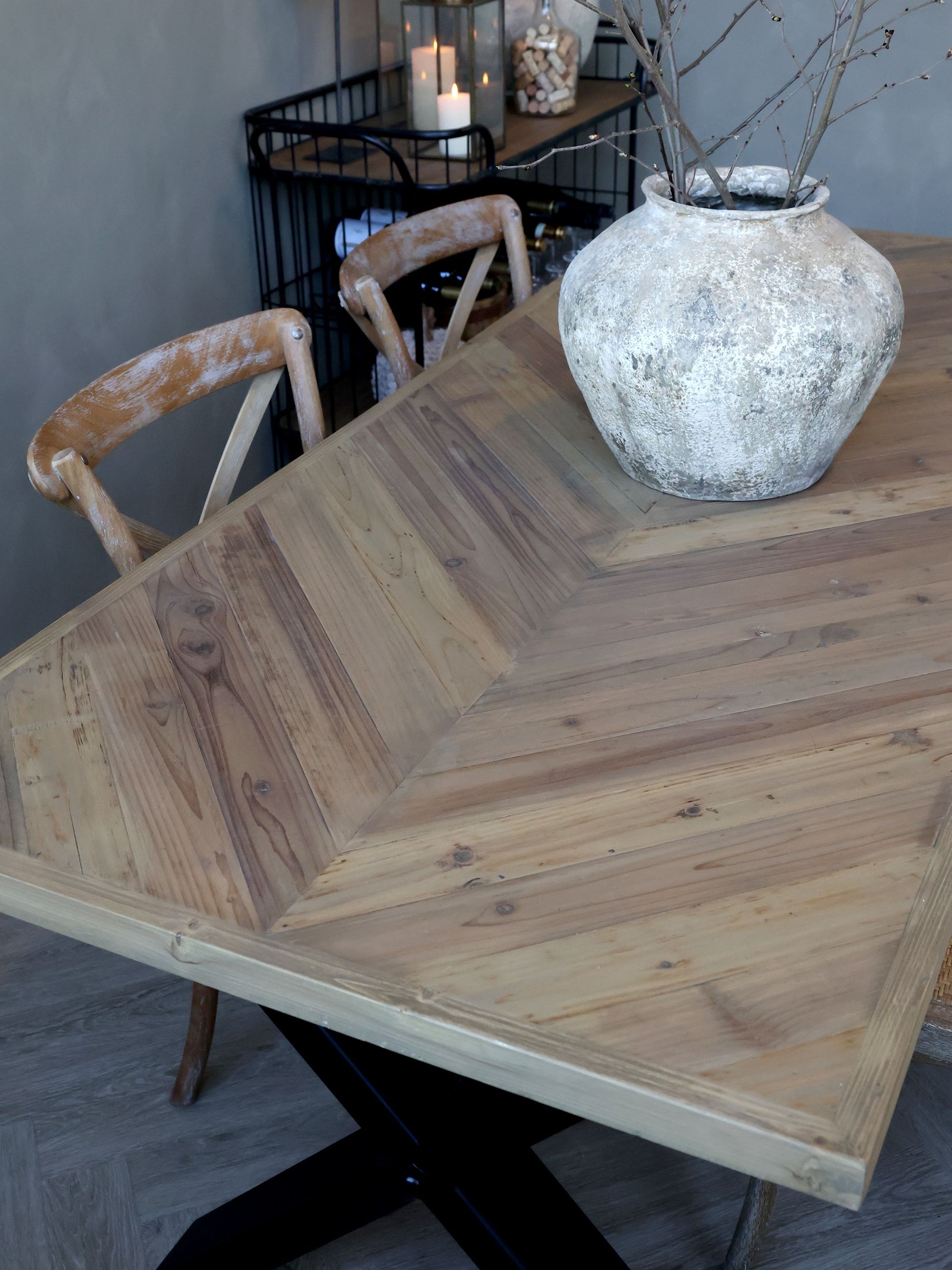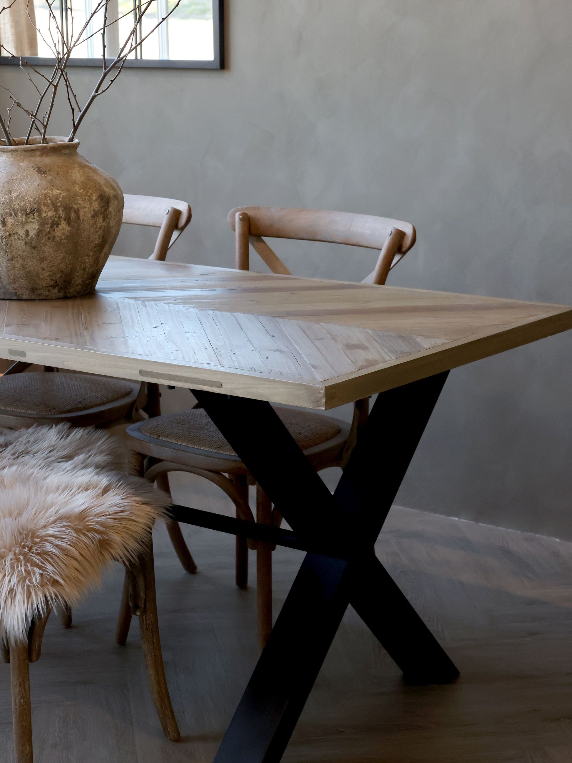 Dieser Esstisch ist ein echter Hingucker. Seine Tischplatte präsentiert ein spektakuläres Fischgrätenmuster, das jeden Raum aufwertet. Er ist handgefertigt aus massivem Kiefernholz mit einer leichten und schönen Holzbeize. Ein moderner Tischständer aus schwarzem Eisen kontrastiert die Tischplatte und betont sie. Größe: H77/L200/B90 cm, Farbe: natur & schwarz.
